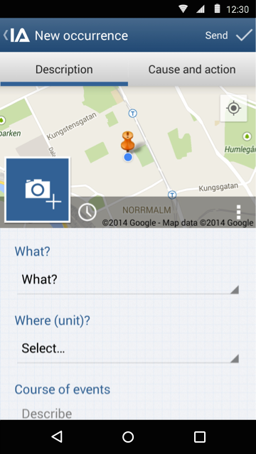 AFA Insurances goal with IA is to reduce occupational injuries. With the IA-app, an employee can effortless register an occurrence. Add pictures of the observation, fill in the applicable information and send it to the backend system. The app also supports safety observations and checklists. Systematic improvement of the working environment have never been easier.