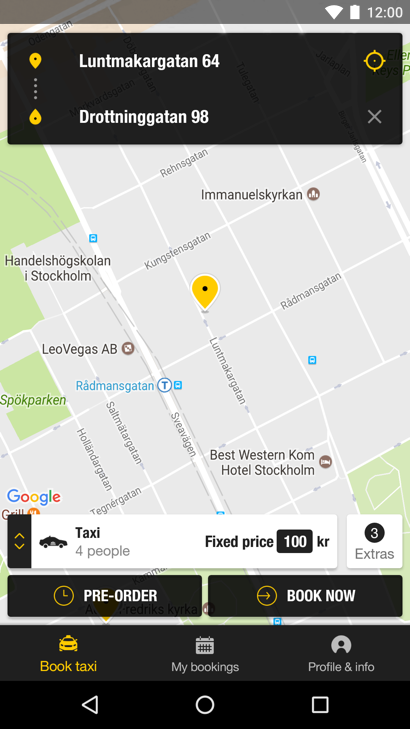 The Taxi Stockholm app lets you book your trip quickly and easily, choosing regular, premium, or large taxis, with or without extras such as a child seat or room for your dog.